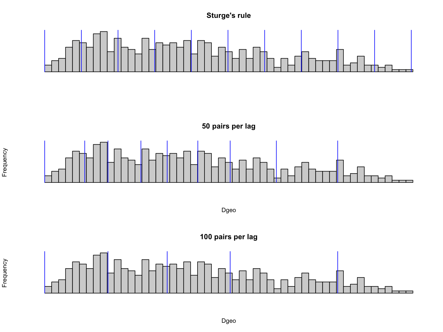 - Not all pairs contribute (equally) to the largest distance classes (those in the center of the study area are not involved in very large distances).