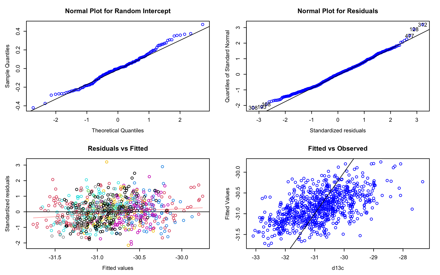 mod4 <- lme4::lmer(d13c ~ 1 + (1|population) + (1|family) + block,
