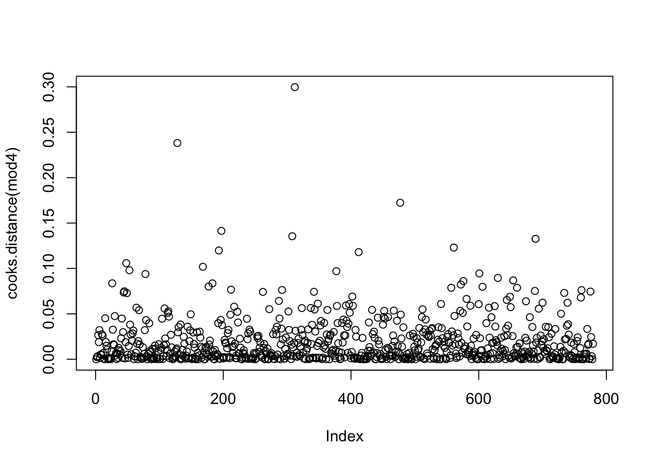 - A plot of Cook’s distances, where D > 1 indicates influential points (more relevant when using quantitative predictors (covariates). Note: this may take a while to calculate.
