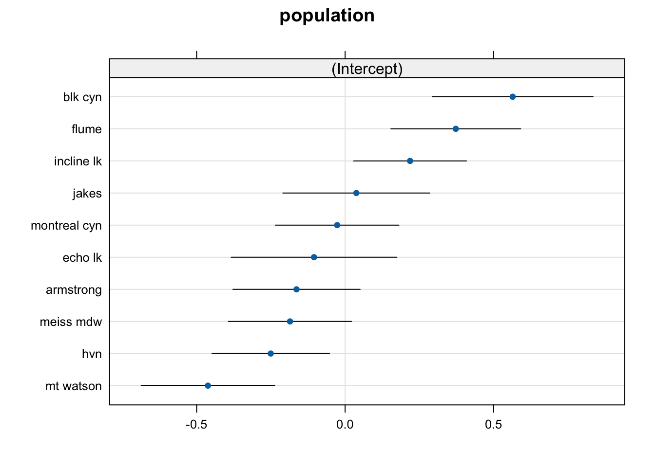 We can see that there are considerable differences between populations, where “blk cyn” has the highest, and “mt watson” the lowest mean.