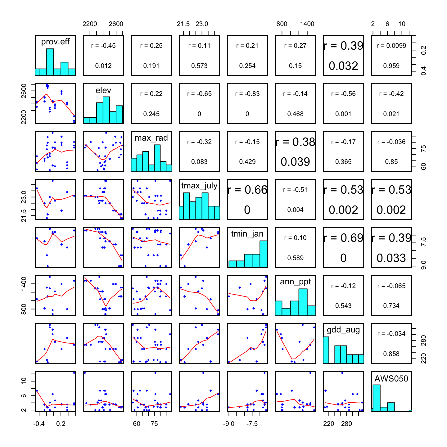 dat2 <- data.frame(prov.eff=prov.eff[index,1], Plot.data[,-8])Now we estimate the correlation between the population effect and each bioclimatic variable. We summarize the results in a correlation matrix plot.