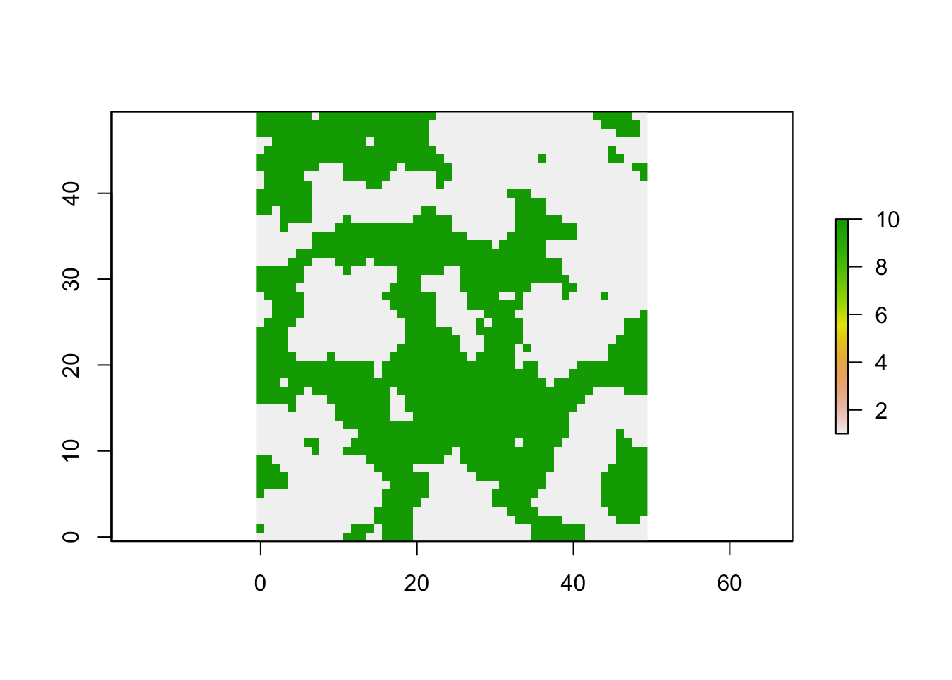 Finally, we create a raster object (package raster``) calledr` with the simulated habitat.